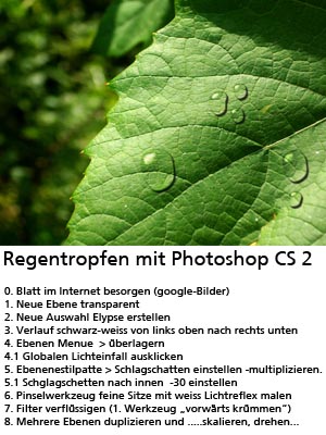 Diese kleinen Photoshoptutorials zum Thema Digitalfotos bearbeiten wurden erstellt, um nach Tagen und Wochen nach einer Schulung das Erinnerungsvermögen ein wenig aufzufrischen!Regentropfen erstellen mit Photoshop